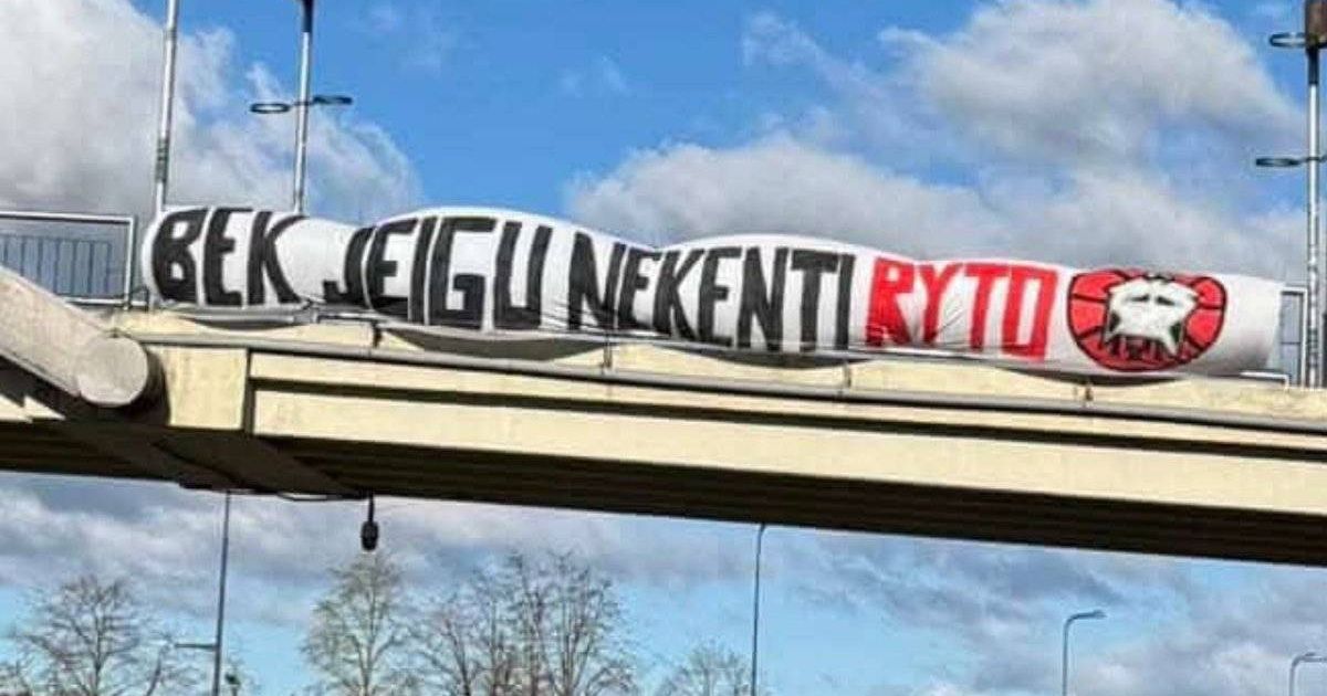 Labai realu, jog šios idėjos autorystė priklauso Kauno „Žalgirio“ sirgaliams: ant transparanto aukštyn kojom nupieštas Vilniaus „Ryto“ logotipas.